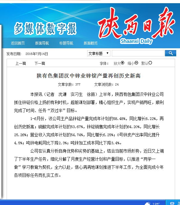 陜西日?qǐng)?bào):陜西有色漢中鋅業(yè)鋅錠產(chǎn)量再創(chuàng)歷史新高