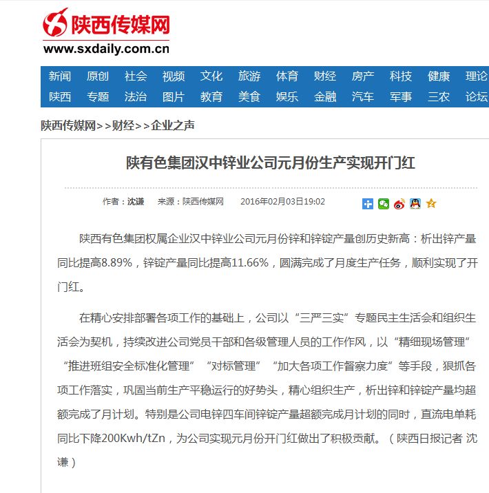 陜西傳媒網(wǎng) 陜西有色集團(tuán)漢中鋅業(yè)公司元月份生產(chǎn)實(shí)現(xiàn)開(kāi)門紅